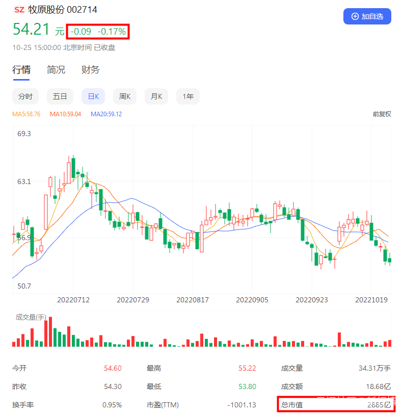 雖然業績亮眼,但今日牧原股份的股價微幅下跌,截至10月25日收盤,牧原股份股價報54.21元,跌0.17%,總市值為2885億元。