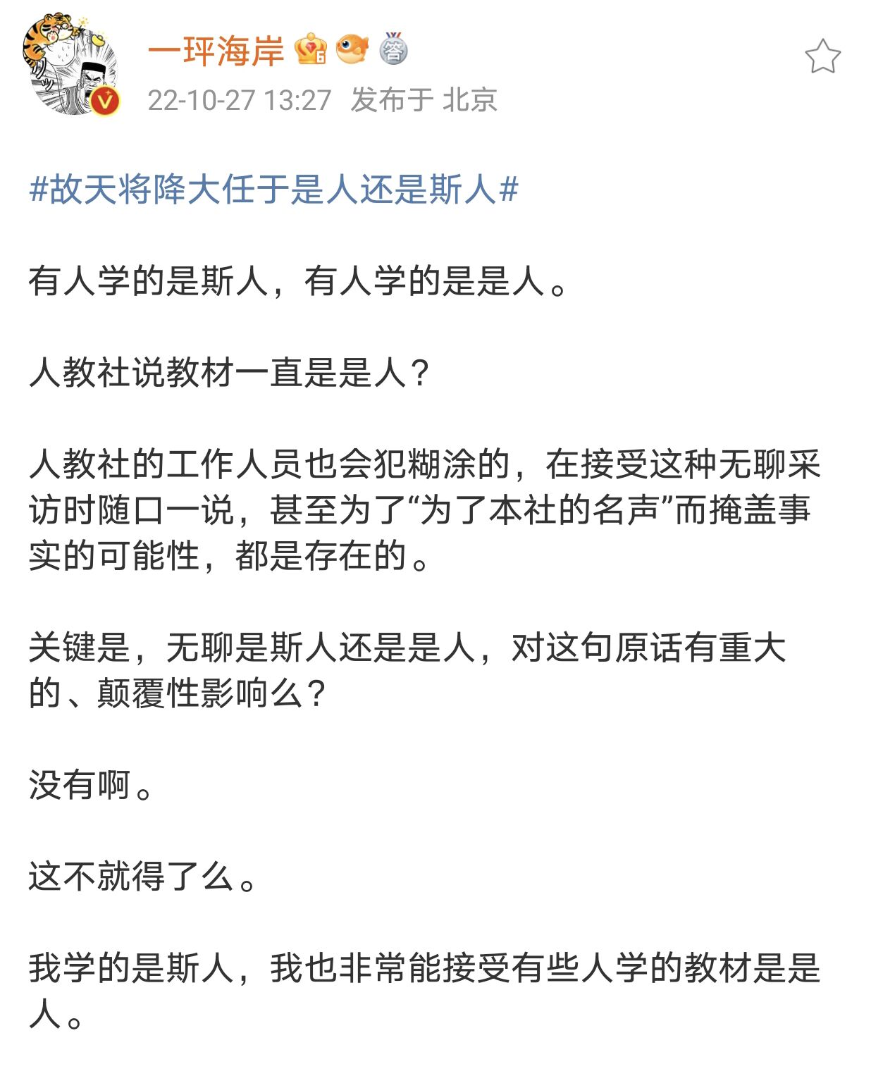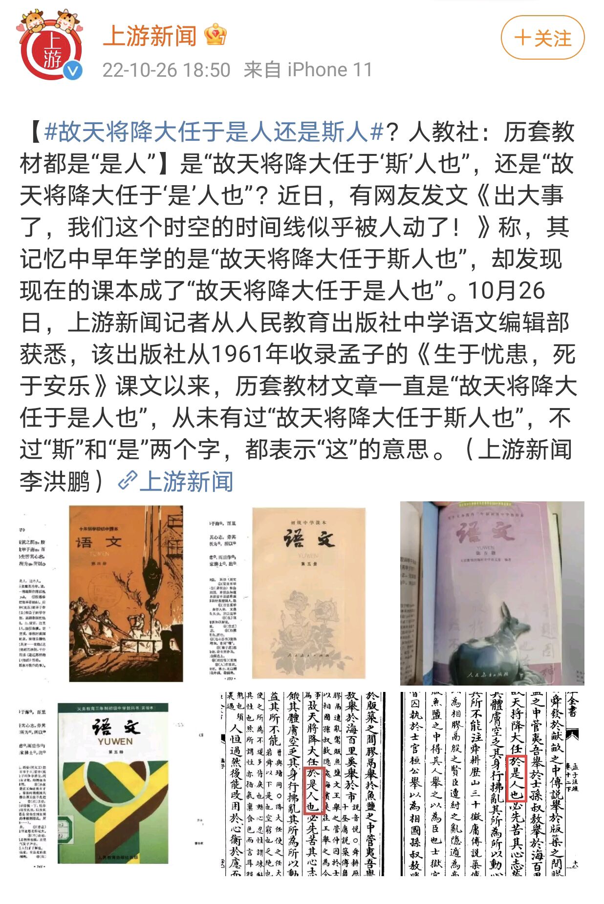 故天將降大任於“是人”還是“斯人”?人教社回應:歷套教材都是“是人”_風聞