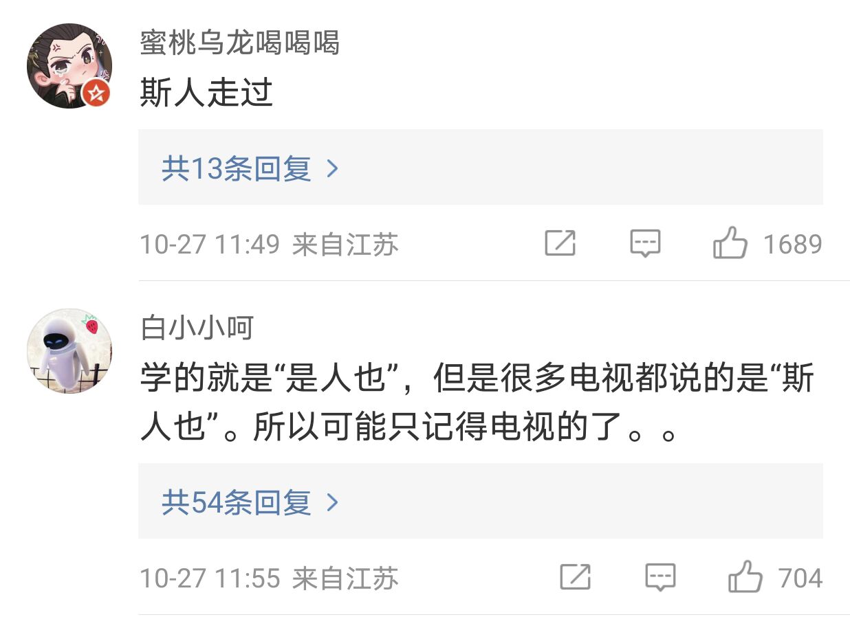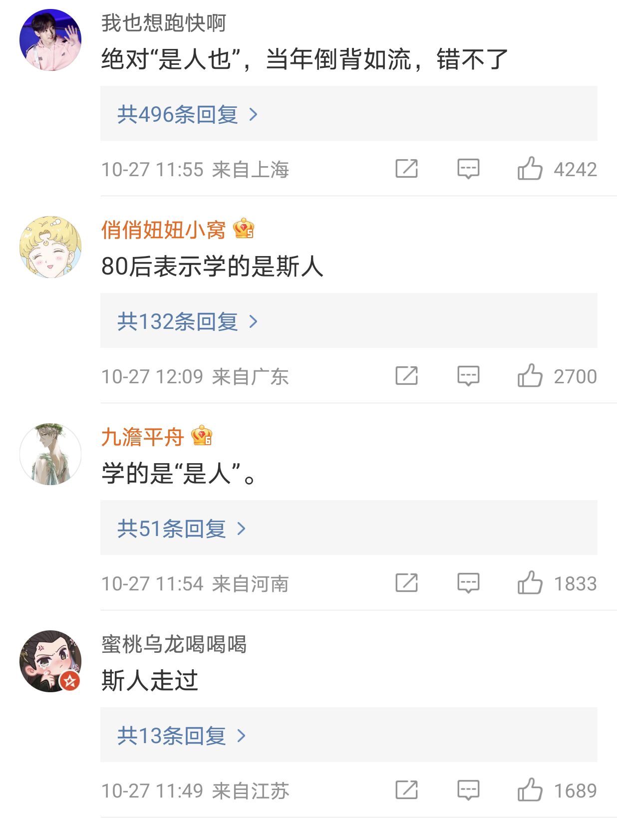 而在微博上,很多人都表示自己以前課本學的就是“斯人/是人”,並都表示自己肯定沒記錯。
