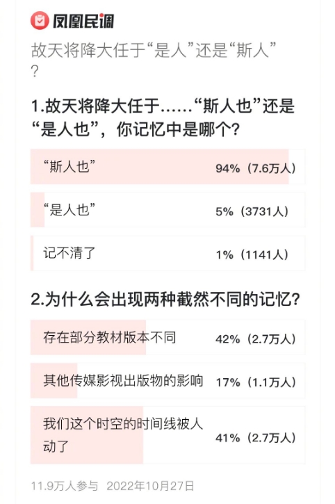 鳳凰網也做了一個民調,在這份民調中,有94%的網友表示,自己當初在教材上看到的確實是“斯人”。