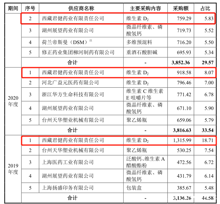 西藏君健藥業有限責任公司為民生健康報告期內第一、第一、第二大供應商,第一、第一、第二大原輔料供應商,也是經銷商,註冊資本2,000萬元。但是愛企查顯示參保人數0,實繳資本715萬元,採購金額也比較大,1,315.99萬元、918.58萬元、759.29萬元,這樣的小公司顯然無法撐起大額採購。在招股書上會稿中主要披露了包裝材料前五大供應商、原輔料前五大廣告供應商、五大供應商、前五大供應商的採購情況,但是第二輪問訊回覆中又出現了前五大廣告供應商。