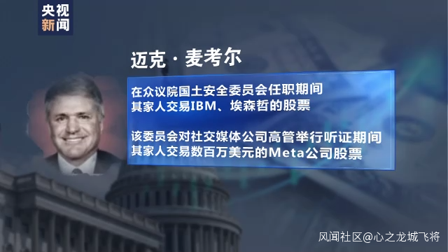 得克薩斯州眾議員邁克·麥考爾(Michael McCaul)在眾議院國土安全委員會任職期間,其家人交易了包括IBM和埃森哲這兩家國土安全部主要承包商的股票。在2019年該委員會就社交媒體公司處理錯誤信息方面對相關公司高管進行聽證期間,麥考爾的家人交易了數百萬美元的Meta公司股票。