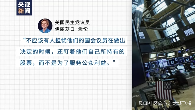 美國民主黨議員伊麗莎白·沃倫(Elizabeth Warren)發帖稱,“不應該有人擔憂他們的國會議員在做出決定的時候,還盯着他們自己所持有的股票,而不是為了服務公眾利益。”