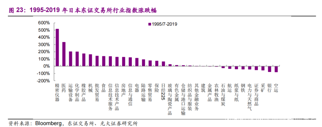 在養老股票表現低迷的同時,製造、消費與醫藥卻成為了老齡化趨勢的受益者。按照光大證券的統計,1995-2019 年期間,日本股市中漲幅最大的板塊為製造、醫藥與消費。