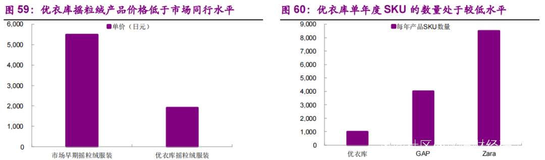 優衣庫的產品設計注重百搭,甚至不區分年齡、性別。因此可形成“大單品、少 SKU”的產品特徵。而這種產品特徵又可以加快週轉,壓低成本。最終使優衣庫的同類產品售價遠低於市場。