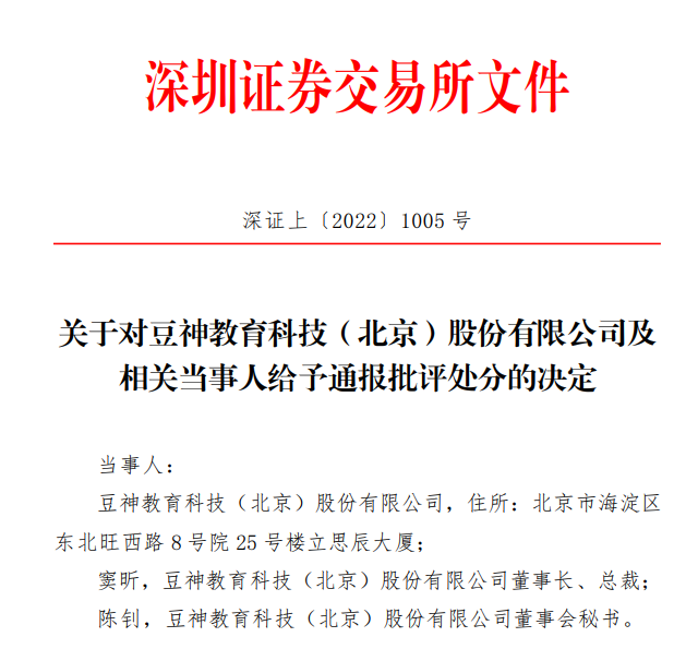 正是因為上述對於關注函的回覆問題,深交所於10月20日發佈通報,對豆神教育及董事長竇昕等相關人員予以處分。