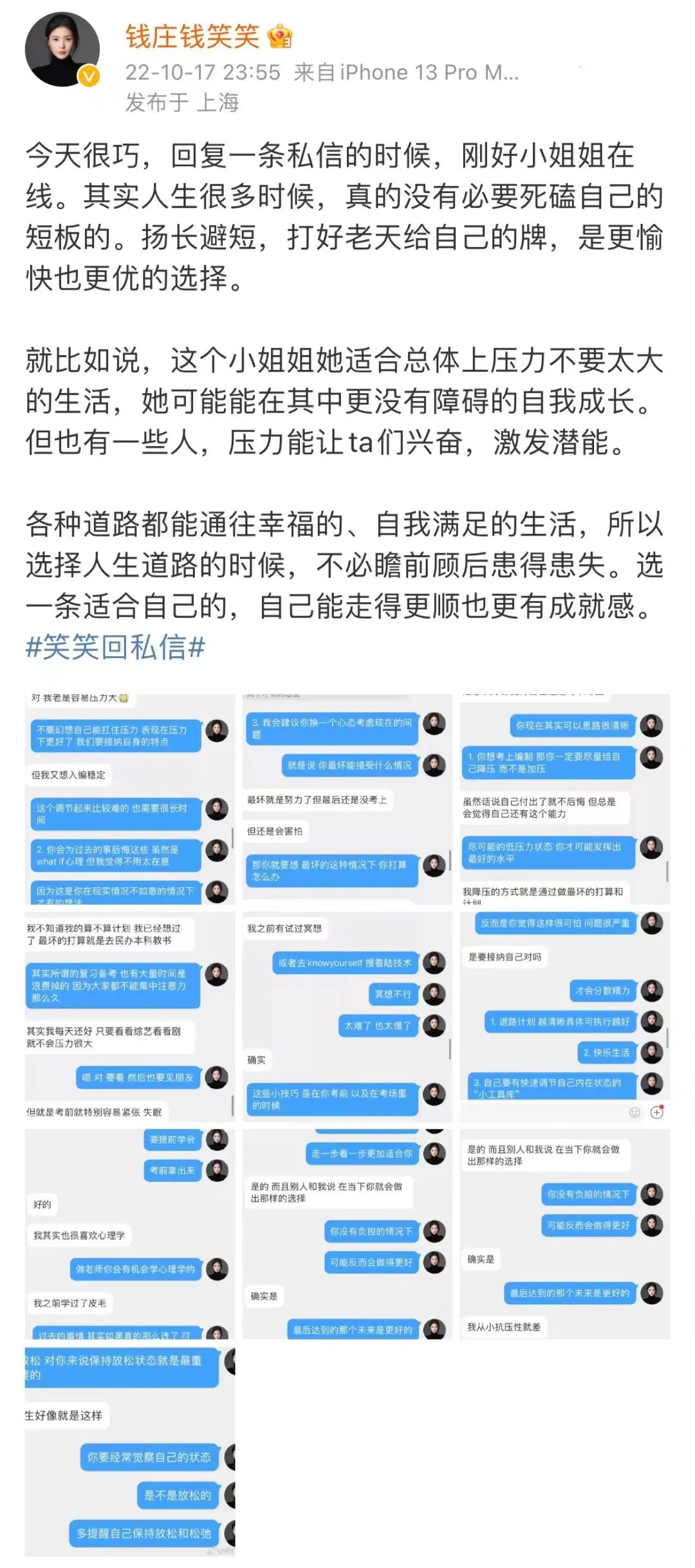 KY小姐姐也在她的微博上真誠回答過一條關於「順應天性」的私信。如果你想看到她關於更多其他話題的分享,或是有困惑想要和KY小姐姐聊聊,歡迎關注「錢莊錢笑笑」,給她發私信吧~