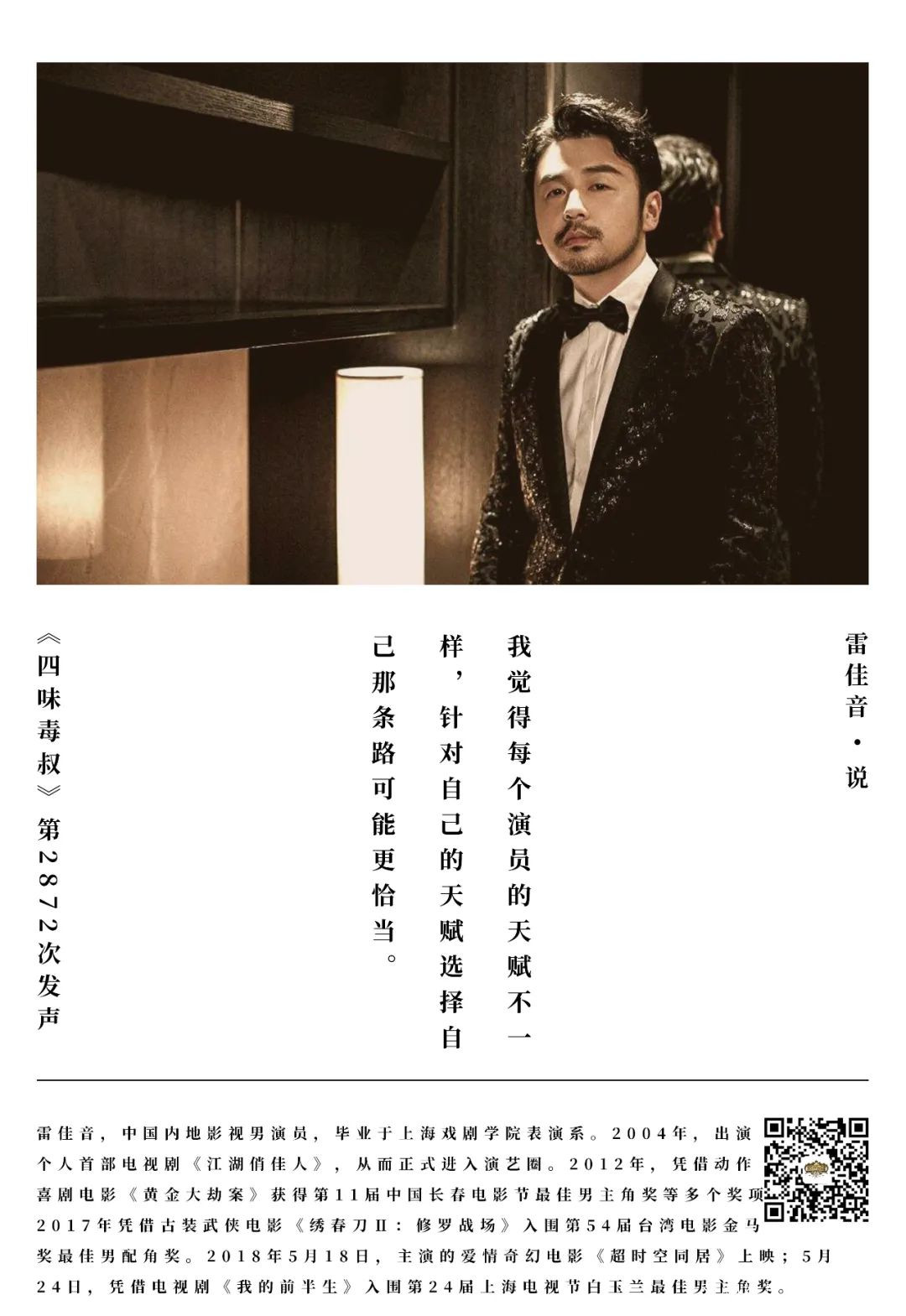 雷佳音:****我認為一個演員是不是好演員首先是這份心。因為每個演員的天賦不一樣,我剛開始學表演的時候吧,就總説我覺得自己特厲害,説你看我這表達能力強、想象力豐富。但這可能只是天賦的一種,誰就能説個高、漂亮不是天賦呢?其實都是爹媽給的。我覺得每個演員的天賦不一樣,所以針對自己的天賦吧,選擇自己那條路可能更恰當。所以我也不能説這種演員就是好演員,那種演員就是不好的演員。但是有一點就是,好演員你必須得有這份心,有這份赤誠,我覺得就可以説,他是一個比較不錯的演員。