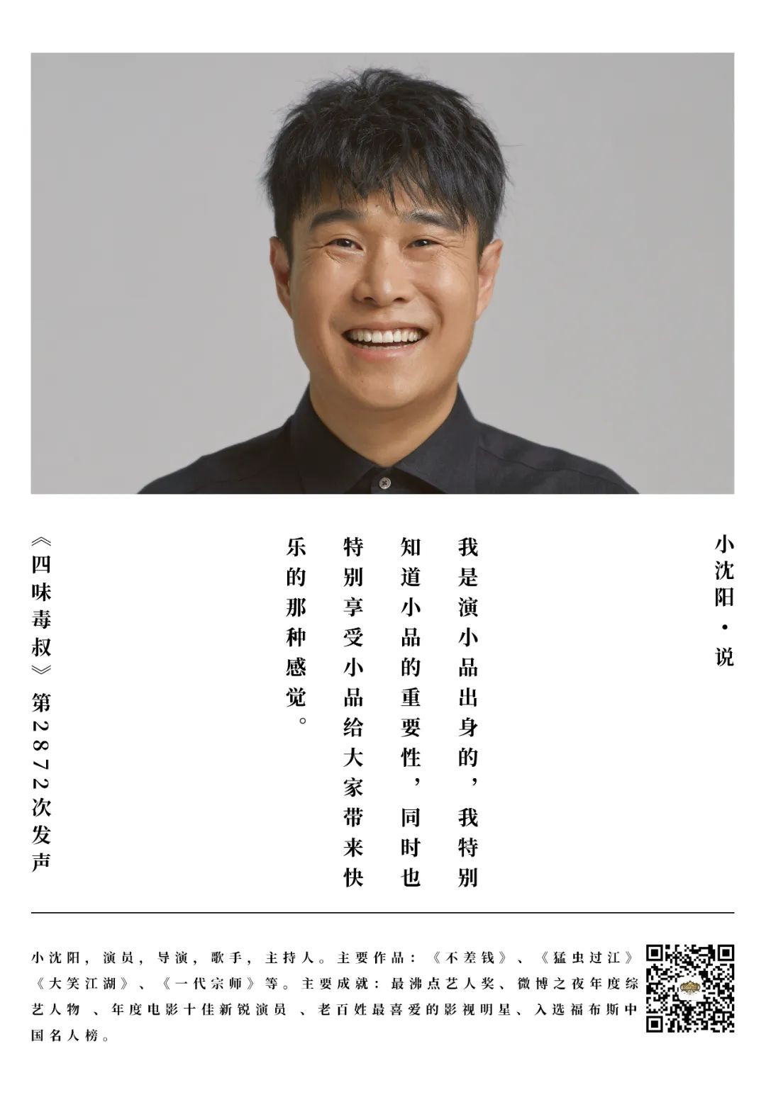 **小瀋陽:**大家對我這句話的意思可能有些誤會,我的説法是,沒有好的小品我是不會再演了,但如果有好的小品出現,我還是會演的。因為我是演小品出身的,我特別知道小品的重要性,同時也特別享受小品給大家帶來快樂的那種感覺。作為一個演員來講,他在台上短短的20多分鐘、15分鐘、10分鐘,能夠把大家逗得那麼開心是一件很爽的事情。