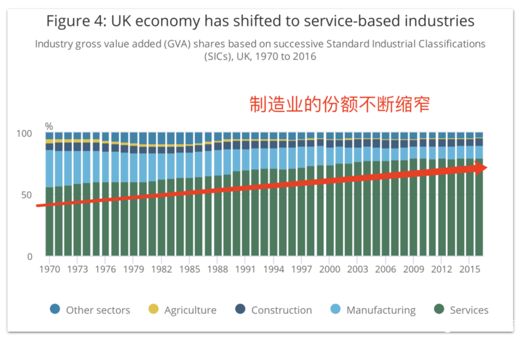 1970年,製造業在英國GDP的比重仍有近40%,四分之一的勞動力都在製造業。但到了1990年,製造業的GDP佔比只有16%左右了。到了今天,製造業在英國GDP裏的比重僅有8.7%。