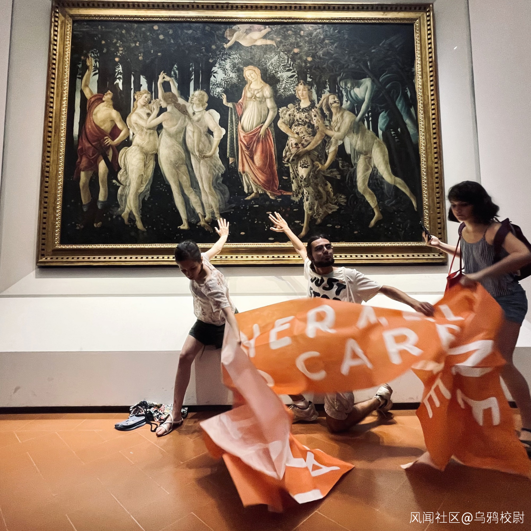 7月22日,意大利環保組織“最後一代”(Ultima Generazione)的抗議者在佛羅倫薩烏菲齊美術館,雖然沒潑食物,但也是**把自己的手粘在桑德羅·波提切利名畫《春》**的保護玻璃上,還展示了“最後一代,拒絕天然氣,拒絕煤炭”之類的橫幅。