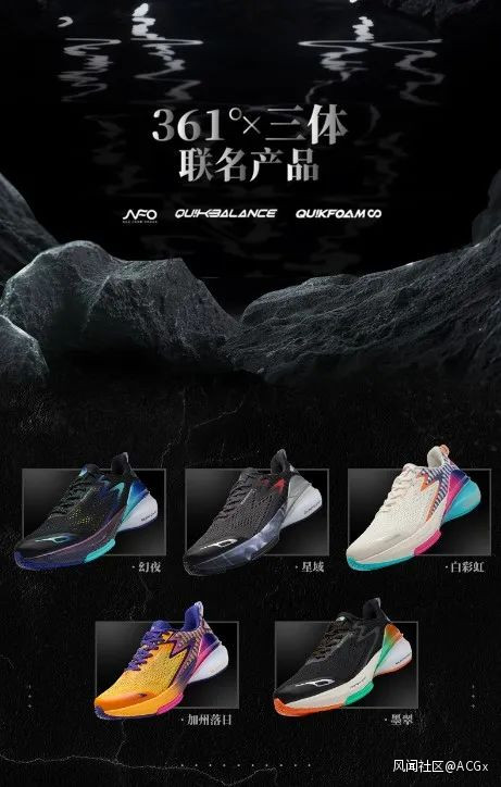 2020年12月,361°與《三體》聯名發佈新款運動鞋。當國產運動鞋品牌紛紛跨入“科技材料”這條賽道時,考驗的就是營銷包裝方式。361°選擇新系統、新品首發與《三體》合作,原因亦在於此。