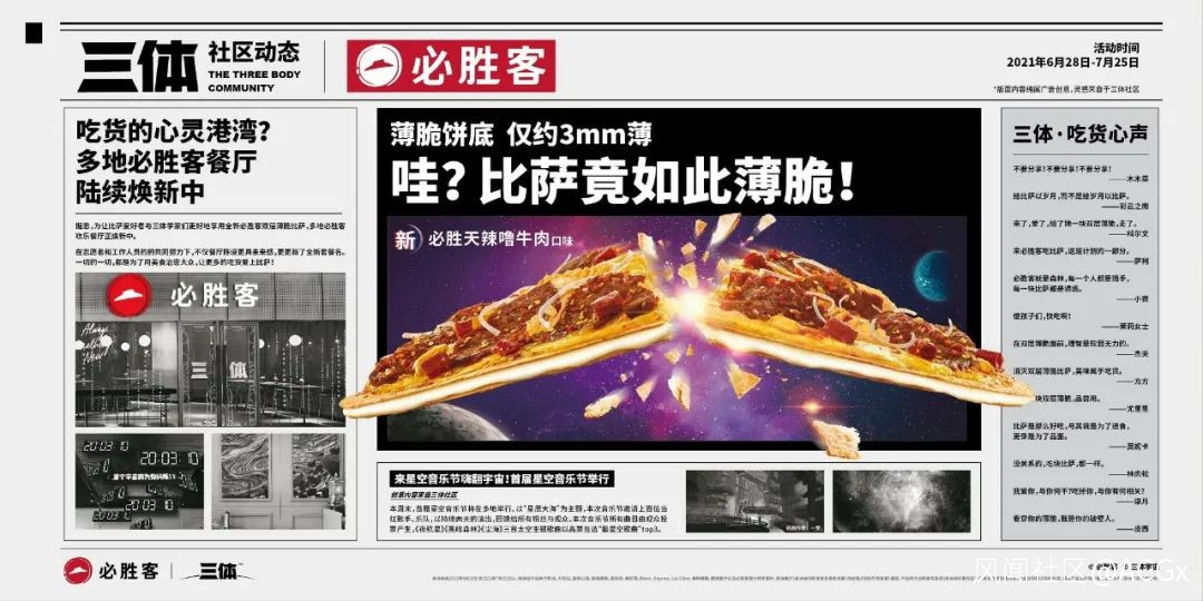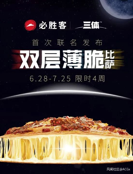 必勝客旗下的雙層薄脆披薩連續3年的營銷路線都是“科技範兒”,“用科技的方式去詮釋比薩的薄脆”。第4年,必勝客終於遇到了《三體》。儘管聯名產品和《三體》真的沒有太大關係,但衝着印刷了大量經典台詞的宣傳圖,你能説它們之間真沒一點關係?