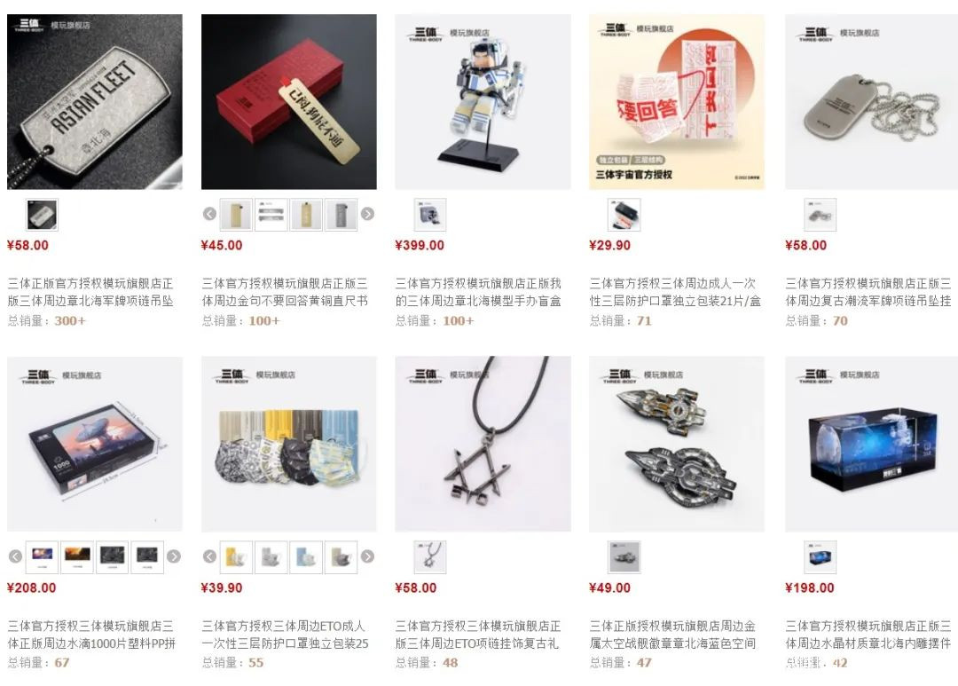 實際上,在IP的衍生開發和授權聯名的過程中,具象化的符號是最有利於建立商品和粉絲之間的直接聯繫,而具象化的符號需要通過影視化內容構建。打開天貓《三體》模玩旗艦店,商品銷量最高的分別是章北海的軍牌吊墜、刻有台詞的直尺和章北海手辦,縱觀整個旗艦店,大量商品都出自同人動畫《我的三體》。作為被遊族收購的同人動畫,《我的三體》影響力一直維持在核心粉絲層面,這也造成了衍生周邊的銷量相較於小説完全不值一提,但是從這些商品卻可以凸顯出小説被具象化後在衍生開發、聯名合作方面所具備的明顯優勢。