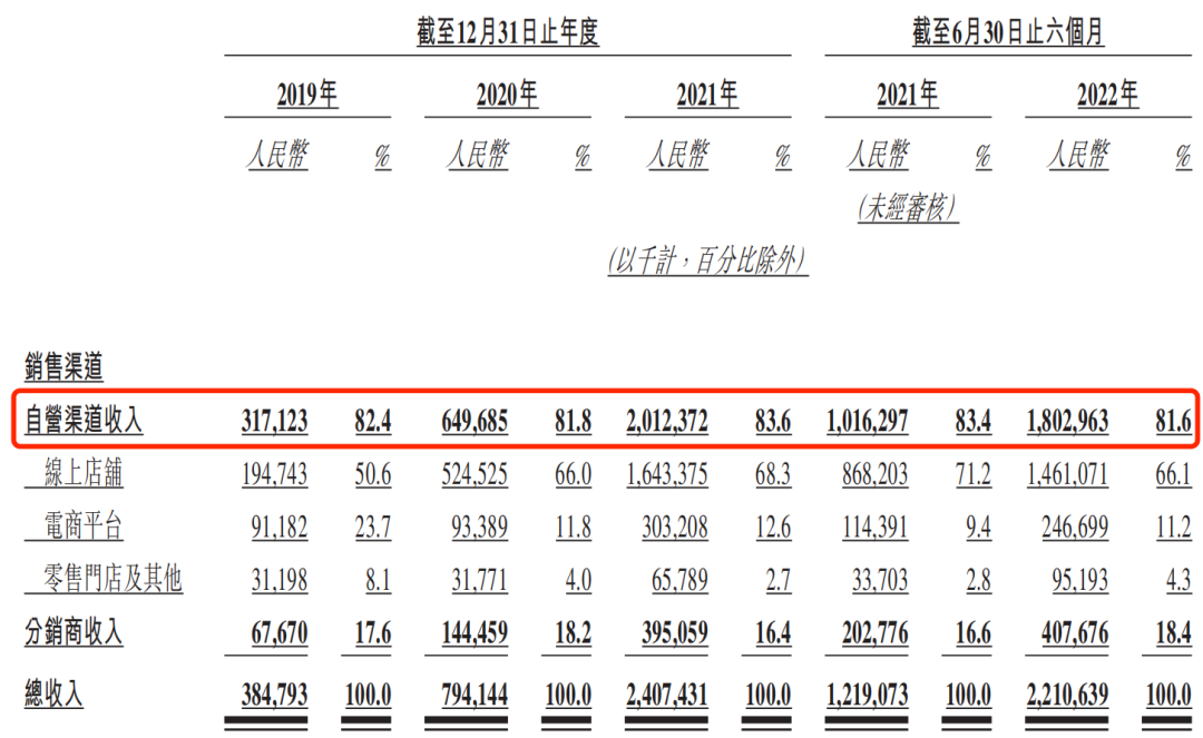 從渠道來看,蕉下一直以自營渠道為主,既能強化品牌形象,還能穩住價格體系。從2019年開始,蕉下八成以上的收入都來自於以線上為主的自營渠道。