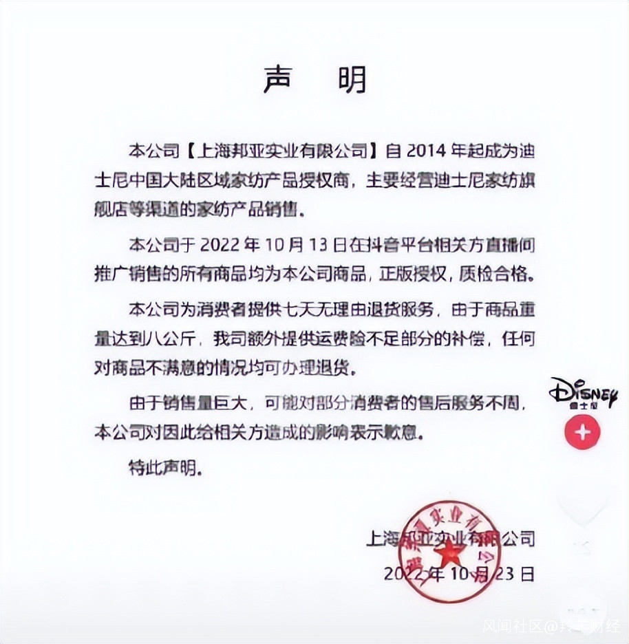 這套迪士尼家紡鏈接店名為“迪士尼家紡母嬰小店”,隸屬上海邦亞實業有限公司。該公司隨後聲明稱:公司自2014年起成為迪士尼中國大陸區域家紡產品授權商。直播間推廣銷售的所有商品均為正版授權,質檢合格。公司為消費者提供七天無理由退貨服務。