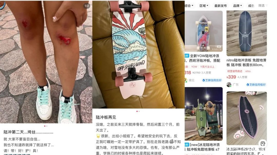儘管不少人是越挫越勇,為了享受“風一般的自由”而繼續陸衝,但也有很多人在看到風險性後入坑即退坑,稱“剛入手一個板子的我決定退了”“一小時前被種草,草都種成樹了,看完小紅書上的各種骨折筆記,根都拔了”“刷到的上一篇筆記是陸衝高手炫技,下一篇就是骨裂,種草即勸退”……
