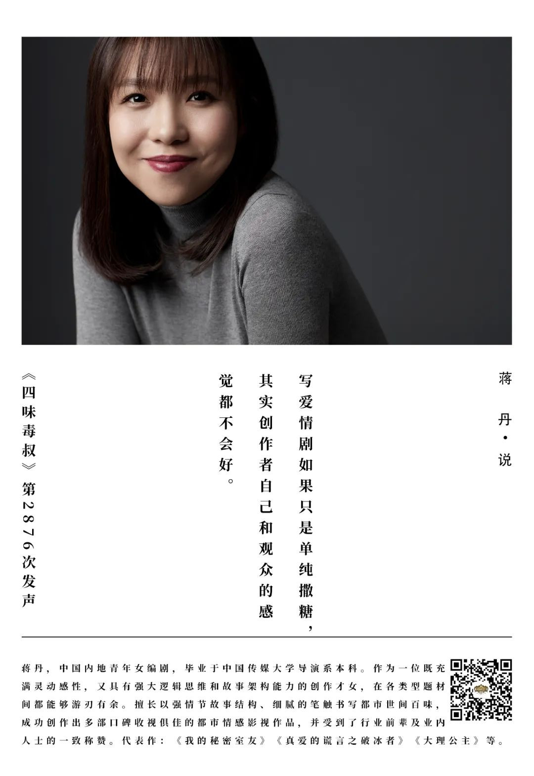 **蔣丹:**剛才於總也説,我們是三組不同的編劇,所以我覺得其中真的是需要一個特別懂戲和強勢的製片人。