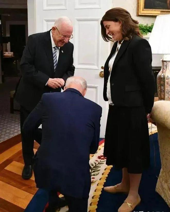 2021年6月,拜登在白宮接見以色列總統魯文·裏夫林,突然對着陪着魯文來訪的以色列女性幕僚長跪下。