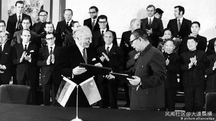 1972年10月11日,德中正式建立外交關係,並宣佈將互派大使。圖為聯邦德國外長謝爾(Walter Scheel)和中國外交部長姬鵬飛在北京簽署聯合公報後互換文本。同年,雙方簽訂貿易協議。