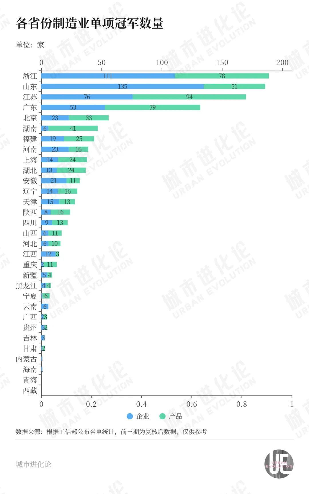 截至目前,全國31省份中僅有青海和西藏尚無製造業單項冠軍的突破。