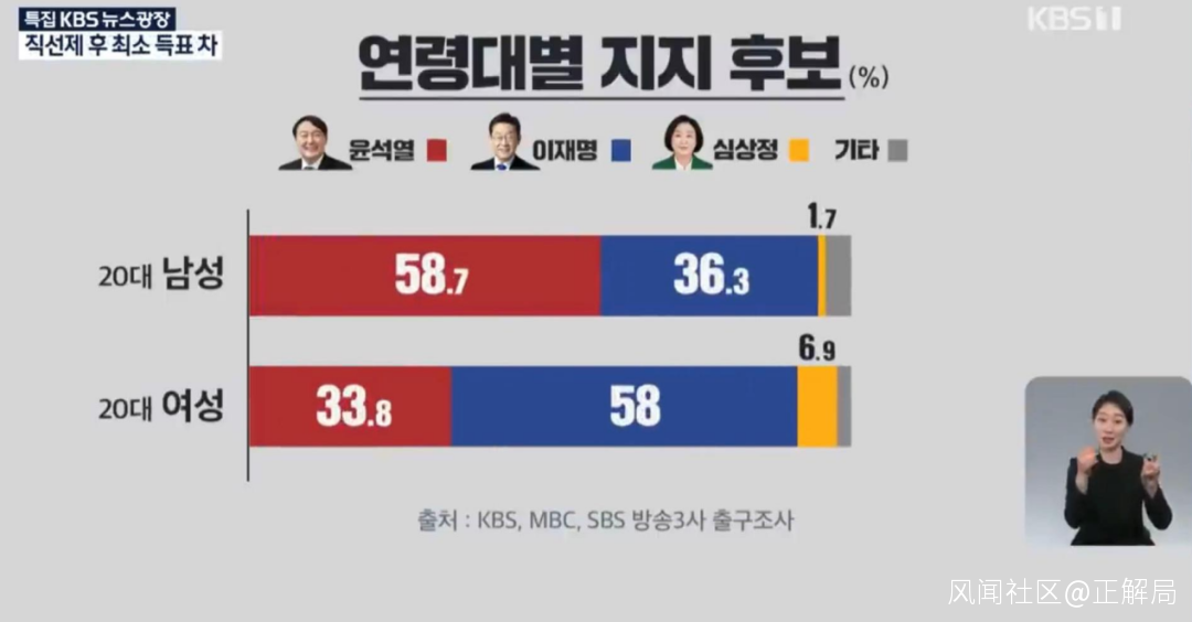 尹錫悦的策略立竿見影,數據顯示,18-29歲的選民中,過半數男性(58.7%)支持尹錫悦,如此基於性別的選票差異是罕見的,也未明顯體現在其他年齡段。