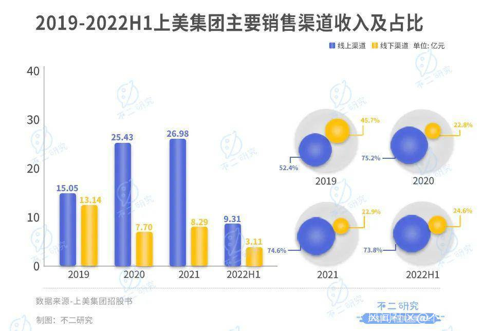 根據招股書,上美的線上渠道貢獻了超七成營收,2019-2022 上半年分別為 15.05 億、25.43 億、26.98 億及 9.31 億,佔比分別為 52.4%、75.2%、74.6% 及 73.8%;線下營收分別為 13.14 億、7.70 億、8.29 億及 3.11 億,佔比從 45.7% 鋭減到 24.6%。