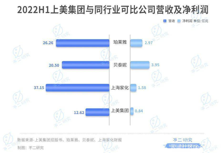 雖然不斷在突破自身,但上美與同行的差距卻不容忽視。財務數據顯示,2022 上半年,珀萊雅營收 26.26 億元、淨利潤 2.97 億元;貝泰妮營收 20.50 億元、淨利潤 3.95 億元;上海家化營收 37.15 億元、淨利潤 1.58 億元。與同行業公司相比,上美的營收規模並不佔優勢,淨利潤則排名靠後,可謂行業內的中等生。