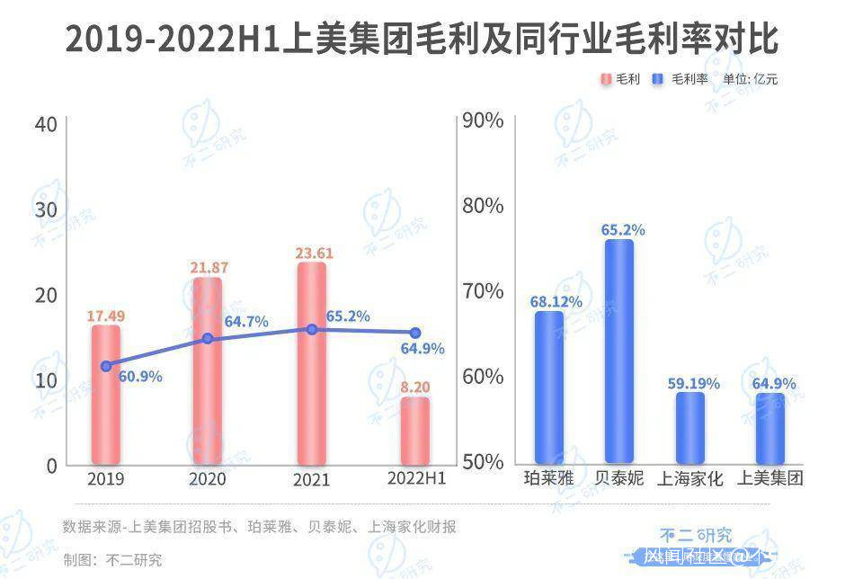 從毛利率看來也是如此。招股書顯示,2019-2022 上半年,上美的毛利率分別為 60.9%、64.7%、65.2% 及 64.9%。相比之下,2022 上半年,上海家化毛利率為 59.91%;珀萊雅毛利率為 68.12%;貝泰妮毛利率為 76.90%。上美在其中並不具備突出亮點。