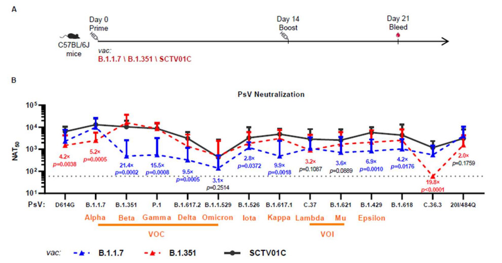 接種三種疫苗後,小鼠對14種主要變異株的中和抗體