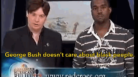 在2005年,侃爺參加一個賑災義演,對着麥克風説時任總統小布什根本不關心黑人。小布什後來回憶,這句話比911事件和入侵伊拉克更讓他鬱悶。