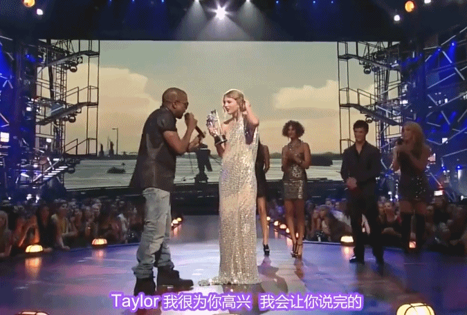 在2009年的MTV頒獎典禮上,泰勒·斯威夫特上台領獎時,侃爺突然衝上舞台,從她手裏搶走麥克風,喊了兩遍“碧昂絲的的MV才是史上最牛X的!”把當時還是新人的泰勒·斯威夫特嚇愣了。