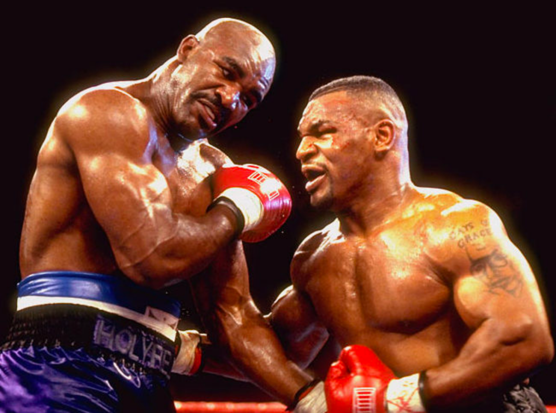 第一場比賽中,霍利菲爾德用“油滑”的戰術,摟抱、頭撞,消耗着泰森。