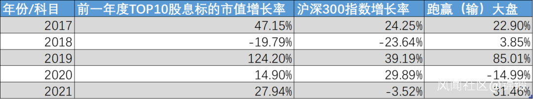 那麼“狗股理論”對於咱A股來説,到底是“後車之師”還是”南橘北枳”呢?我們用2016-2021過去五年的收益為基數,進行了測算,選中每年股息率最高的前十個股,可以發現運用“狗股理論”,五年間僅有2020年跑輸了大盤。