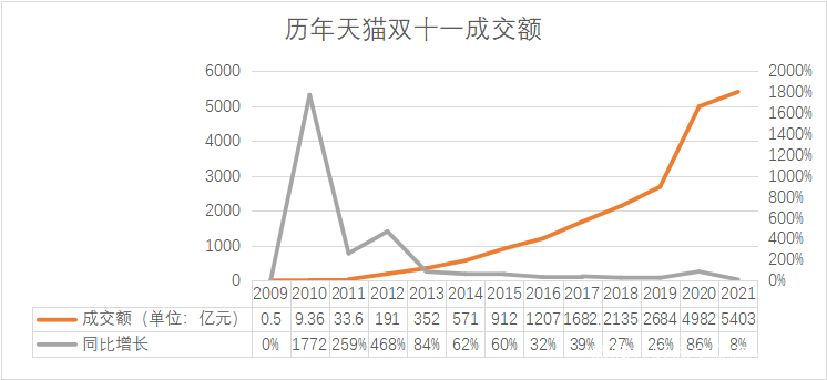 歷年天貓雙十一成交額持續增長,但在數據對比中還是難掩疲態。