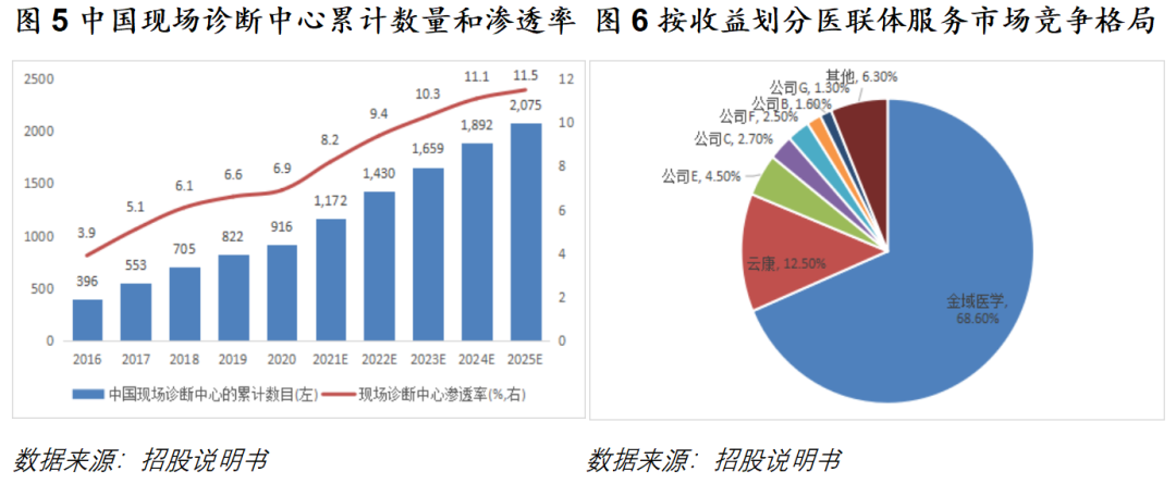 截至2020年底,中國共有916個現場診斷中心,預計20-25年的複合年增長率為17.8%,而現場診斷中心在中國二級及三級醫院的滲透率預期將由2020年的6.9%增長至2025年的11.5%。以2020年收入衡量,雲康佔12.5%的市場份額,是中國為醫聯體提供診斷檢測服務市場中第二大的服務供應商。