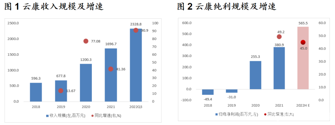 近幾年來,雲康業績持續高漲,收入自18年的5.96億達到21年年賺17億,年複合增長率達58.22%,淨利潤自20年扭虧為盈,21年同比增長47%,22年前三季度同比更是增長90.9%,主要得益於為醫聯體提供診斷檢測服務板塊產生的收入大幅增長。