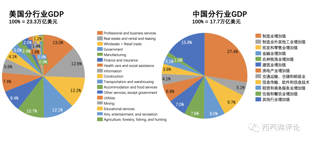 世界各國披露GDP的同時,也會披露按各行業的增加值。中國和美國的行業劃分標準並不一致,但有一部分行業還是可以參考。