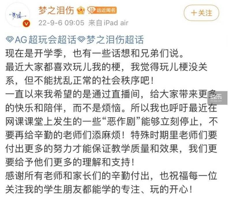 9月6日,夢淚本人在微博發聲,表示自己“有一些話想和兄弟們説”,呼籲適度玩梗,停止網課“惡作劇”。夢淚在最後表達了對老師和家長們辛勤付出的感謝,言辭懇切。