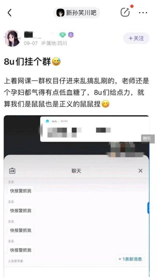 孫笑川吧裏或許沒有越南女友,但確實有關於網課爆破的討論。9月5日,在一個名叫“夢淚大軍入侵網課真的服了”的帖子裏,樓主放出了一段網課入侵視頻,底下的120條回覆大多都表示鄙夷:“純純小丑行為。”在隔壁新孫笑川吧,有人直接把爆破羣截圖發了出來:“吧友們掛個羣,就算我們是鼠鼠,也是正義的鼠鼠捏。”