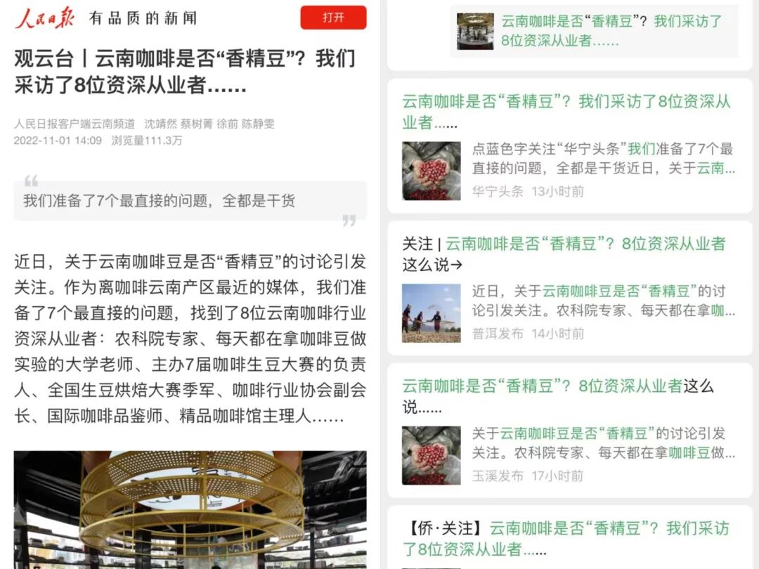 11月1日,人民日報客户端專程採訪了包含農科院專家、咖啡生豆大賽負責人在內的7位雲南從業者,通過問答的形式發文,客觀展示了雲南咖啡的真實現狀,數十家媒體/自媒體賬號先後轉發。