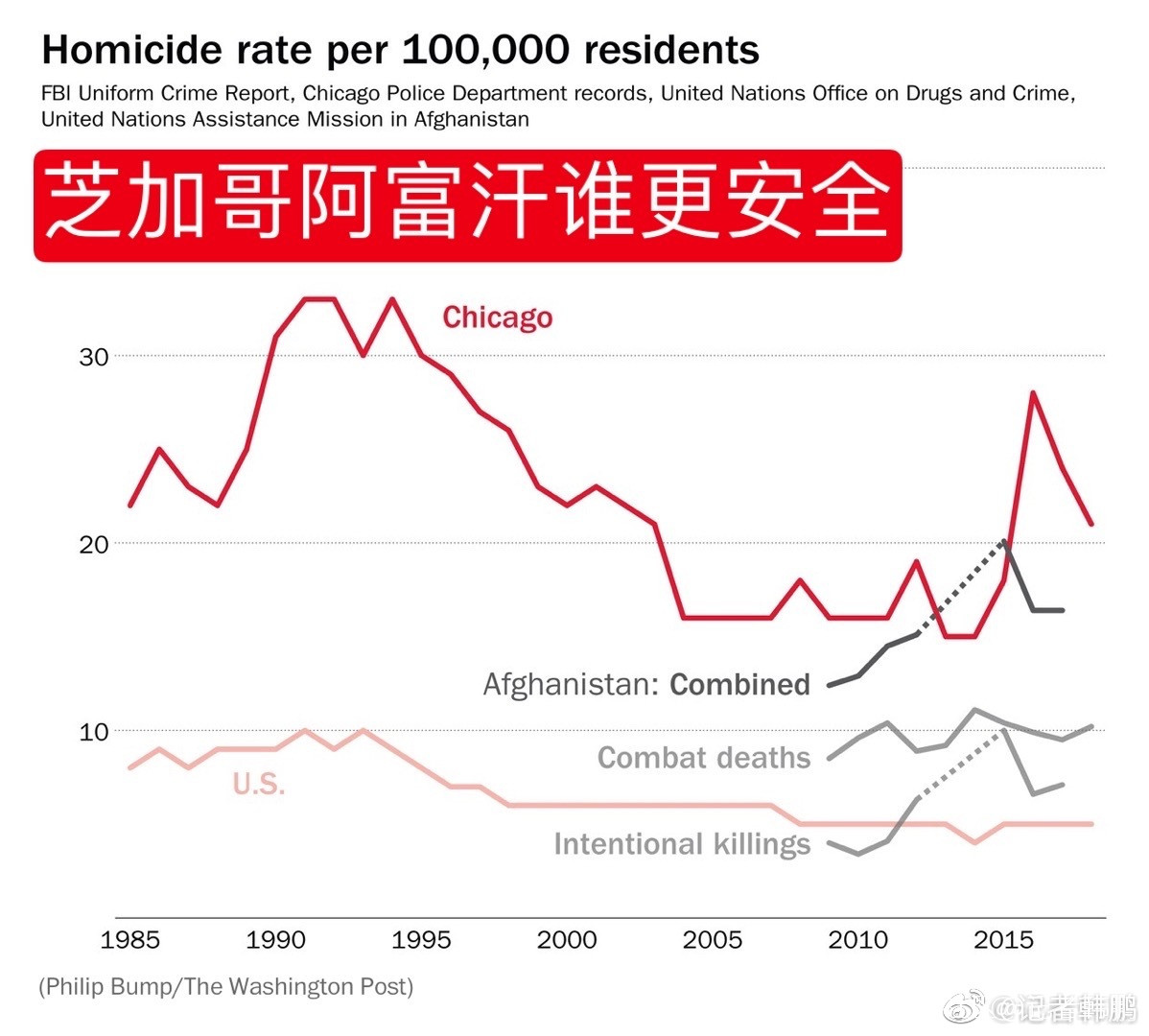 ——延伸一句:芝加哥和阿富汗,到底哪裏更安全?用數據説話!從【每10萬人有多少人死於謀殺】的數據看,芝加哥是28人、阿富汗是7人,阿富汗更安全;從【每10萬人有多少人死於謀殺+戰爭】的數據看,芝加哥是28人、阿富汗是16人,居然還是阿富汗”更安全“!但是,阿富汗還有更多人【死於饑荒、貧困、自然災害】等,所以總體上説,芝加哥”險勝“,比阿富汗安全一丟丟。(數據來源:美國FBI、聯合國)