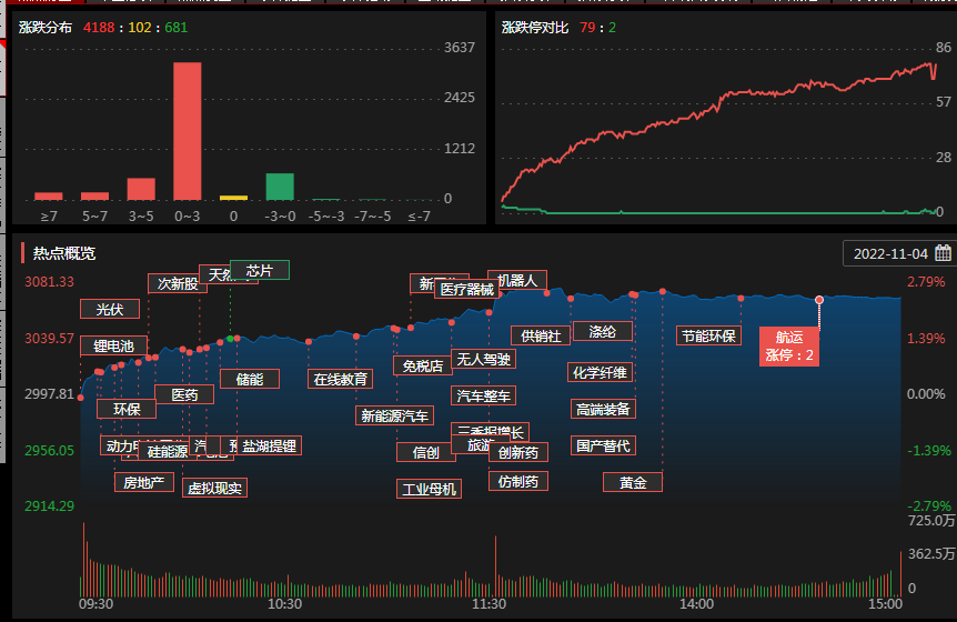 4188只股票上漲,681只股票下跌。其中漲停股79只,跌停股2只。漲停股主要集中在鹽湖提鋰板塊、信創概念股、供銷社概念股等。