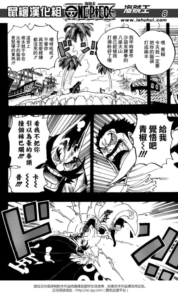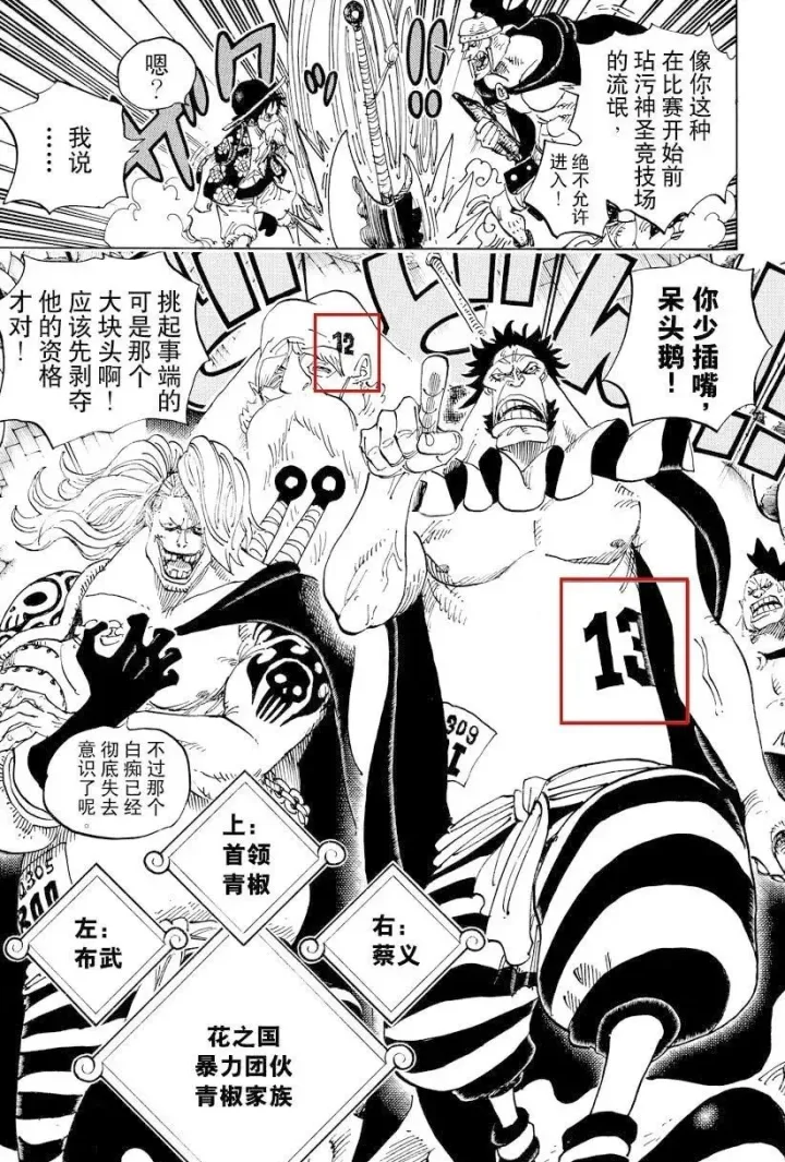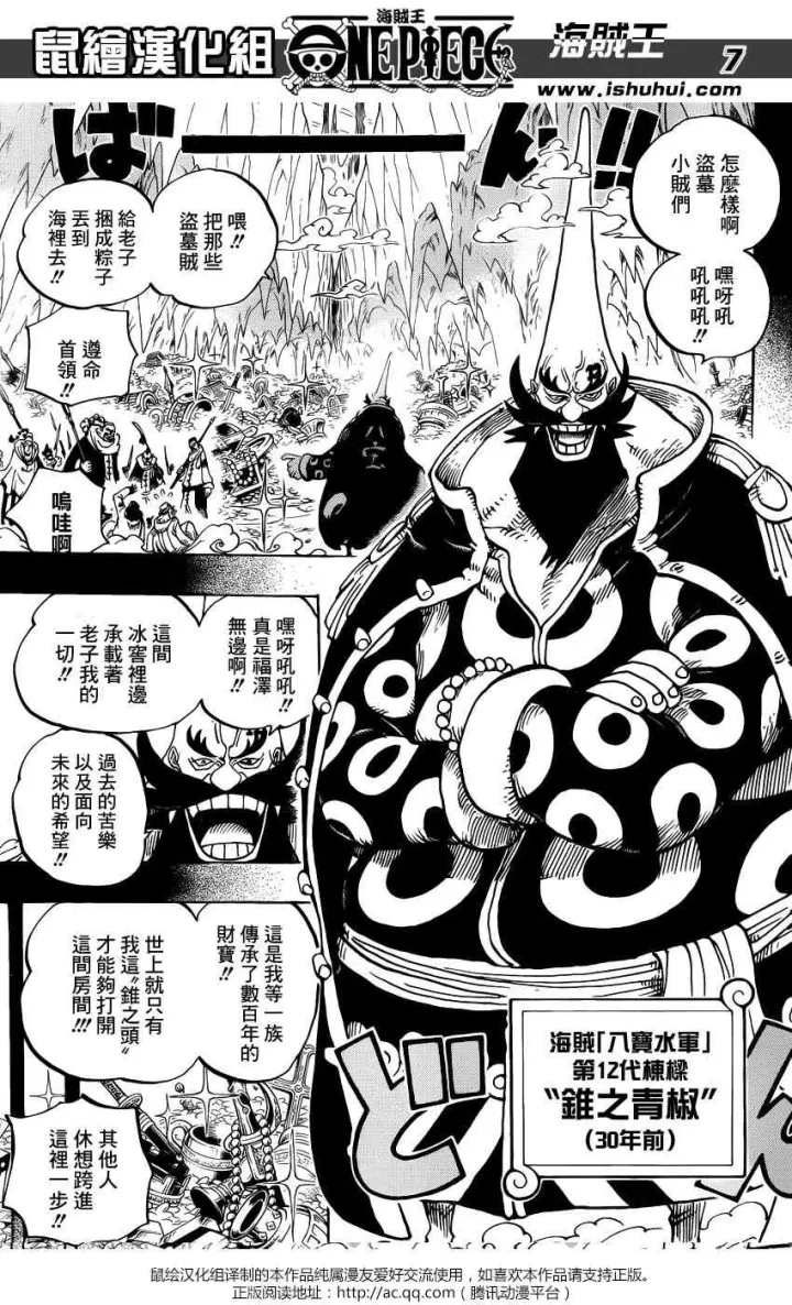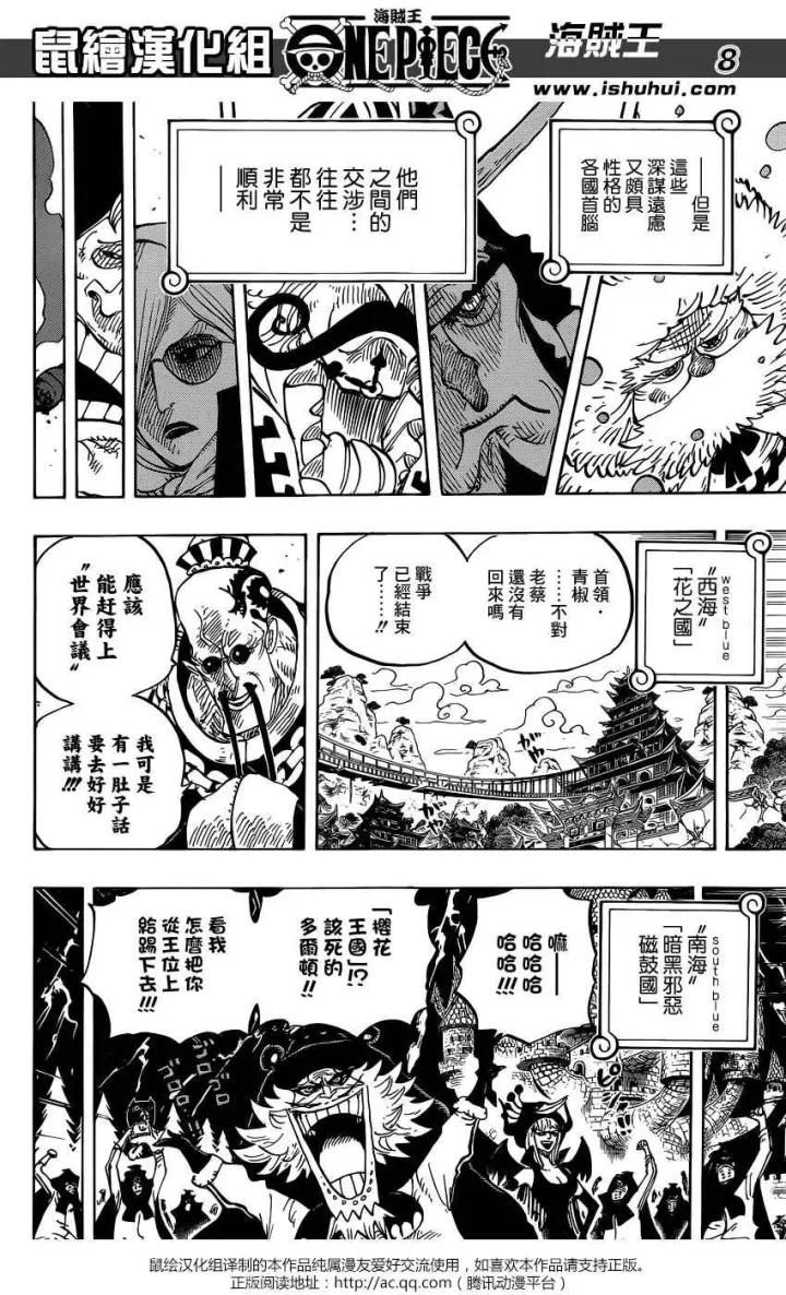 看下圖:中間一格,標示着“花之國”,背景樓閣與上圖的樓閣是一樣的,並且最明顯的是花之國國王的形象——尾田直接用“滿大人”形象來畫——注:這個猥瑣的滿大人形象叫傅滿洲,是歐美用來侮辱我們華人而創作的負面形象,尾田在海賊王中直接採用,誠實的講,是非常不厚道的行為,不過今天本文不討論尾田藉機辱華之事,我們只分析“八寶水軍”。