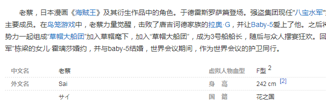最後,尾田把八寶水軍第十三代棟樑的名字叫“老蔡”——台灣省的蔡英文,很可能就是別有用心了,我們來看看蔡依林的英文名字的寫法——Jolin Tsai,Tsai就是蔡了,而老蔡的日語名和英文名都在下圖中“sai”——聯想式伸延是尾田習慣性用法,比如傑爾馬66——Germa 66,Germa就是德國人英文german減去最後一個字母N,而66是聯想式伸延——比如烏克蘭用88代表納粹,希特勒的納粹黨號是55號,所以尾田用66來聯想式伸延,同理,Tsai蔡用sai來延伸,而細節更能看出尾田在設計過程中的思考邏輯,也就更能看出尾田的用心了。
