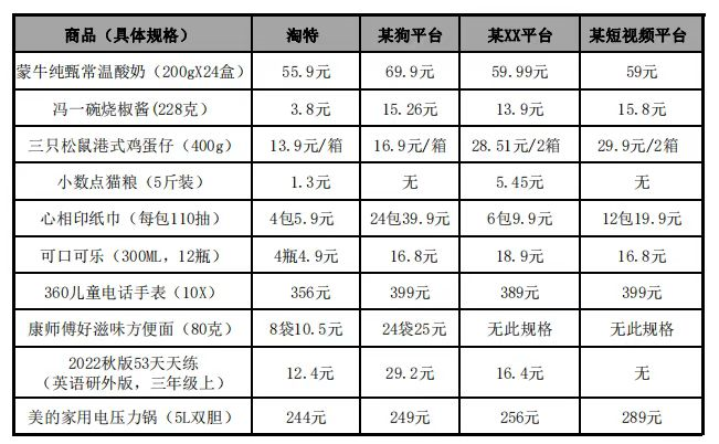 對於這一點,10月22日至10月26日,記者在淘特APP隨機選擇幾款“比價王者”商品,在不同平台,於同一時間段搜索同品牌規格產品,進行橫向比價,得出了這樣的比價結果。