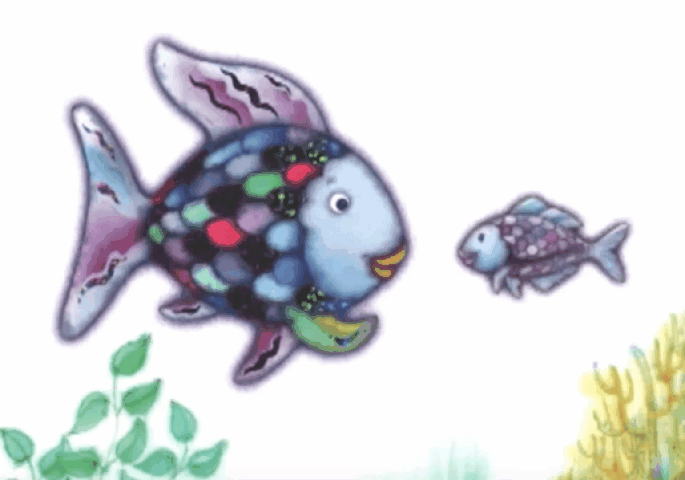 有一天,晚上我送他上牀睡覺,順手拿了他本週挑選的繪本,讀給他聽。這本書叫做 The Rainbow Fish (彩虹魚)。