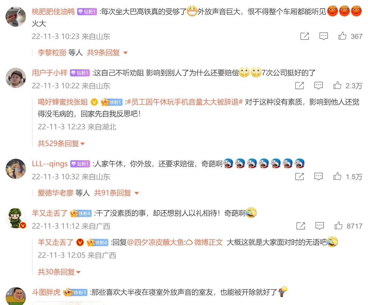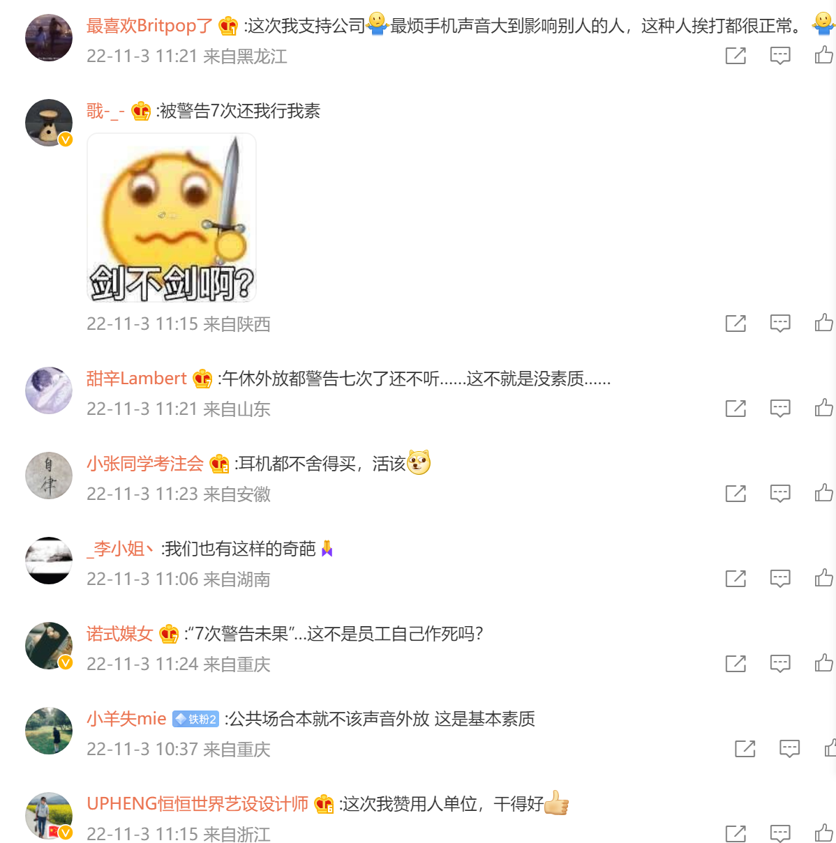 該事件於近日衝上微博熱搜,引發了網友討論。因為辦公室外放聲音已經成為很多打工人的噩夢。網友一致認為“幹得漂亮”。辦公室是公眾場所,本身就應該注意影響,自己暢快了,可是卻給別人帶來噪音。而作為公司方,在7次警告之後才開除,已經仁至義盡。