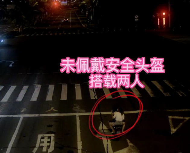男子駕駛電動輕便摩托車載人闖紅燈現場。視頻截圖 交警提供