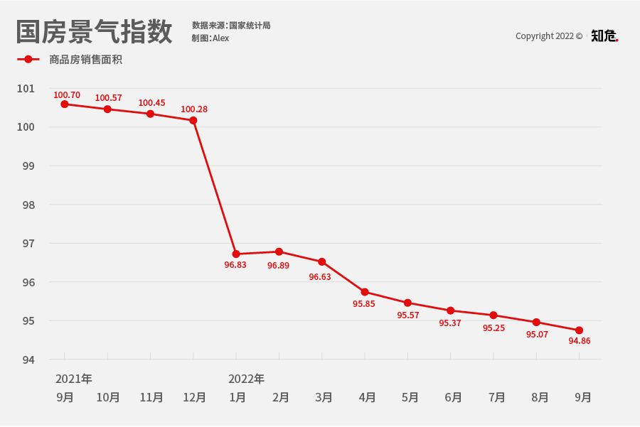 而全國房地產開發景氣指數,已經一路下跌到 9 月的 94.86 。